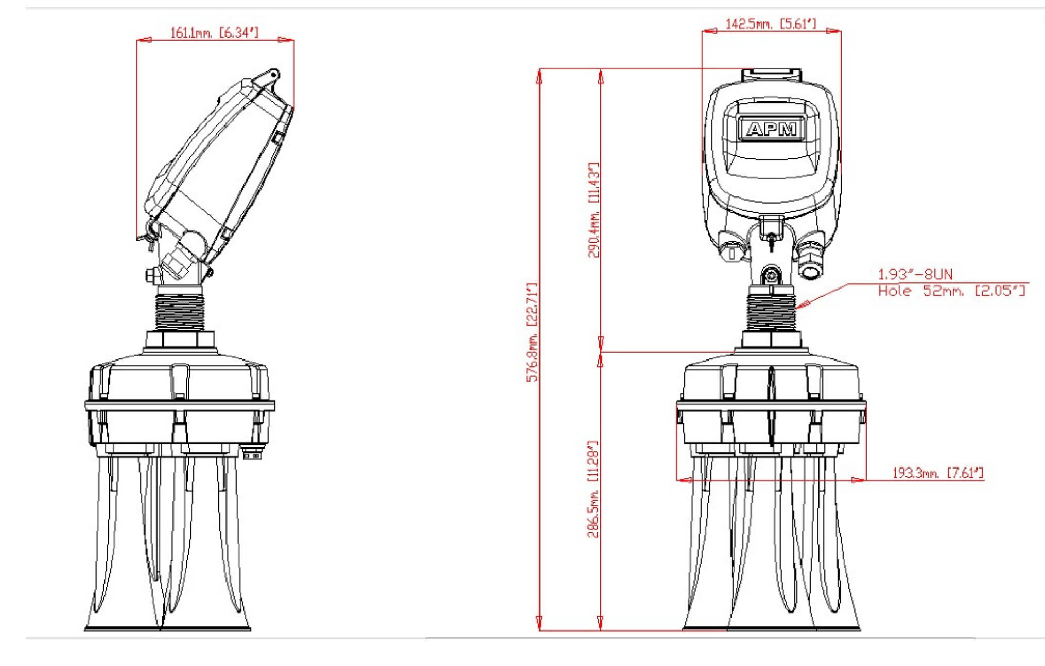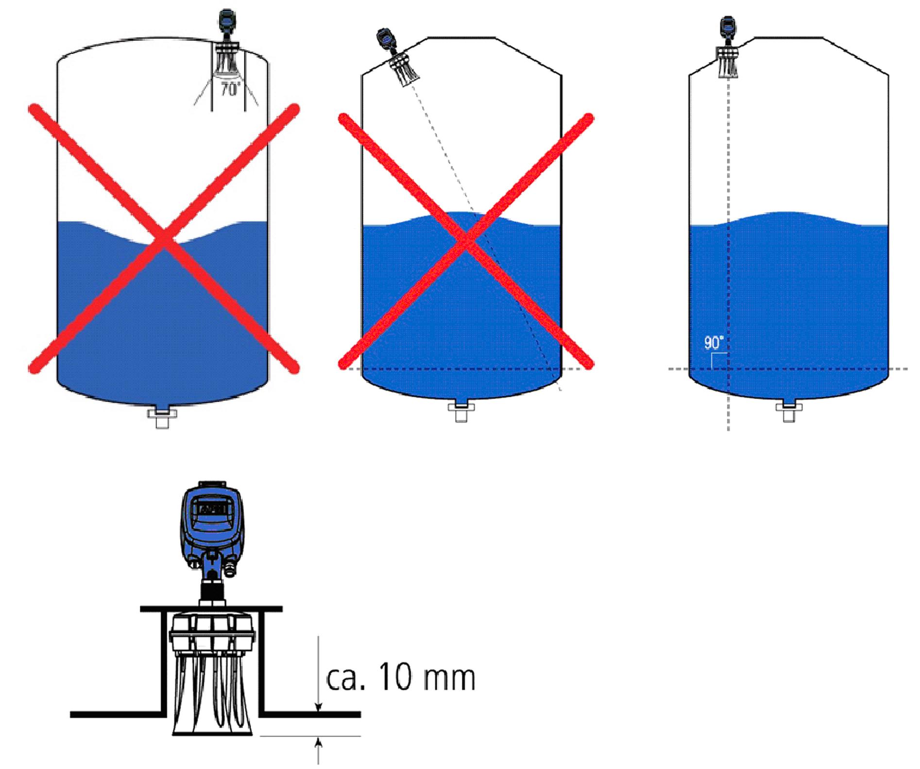 正確的安裝位置為:離罐壁距離為罐直徑1/6處,最小距離為500mm。 不可安裝在入料口上方。 盡可能避免罐內(nèi)障礙物,如開關,儀表,加熱線圈,真空環(huán)和擋板等等 喇叭口進入料倉不小于10mm 必須垂直安裝于料倉 |